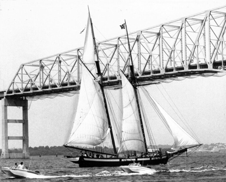 Pride sailing toward the recently opened Francis Scott Key Bridge, photographed by The Baltimore Sun as she returned to the Inner Harbor at the conclusion of her maiden voyage on June 23, 1977. (Baltimore Sun photograph by Lloyd Pearson)