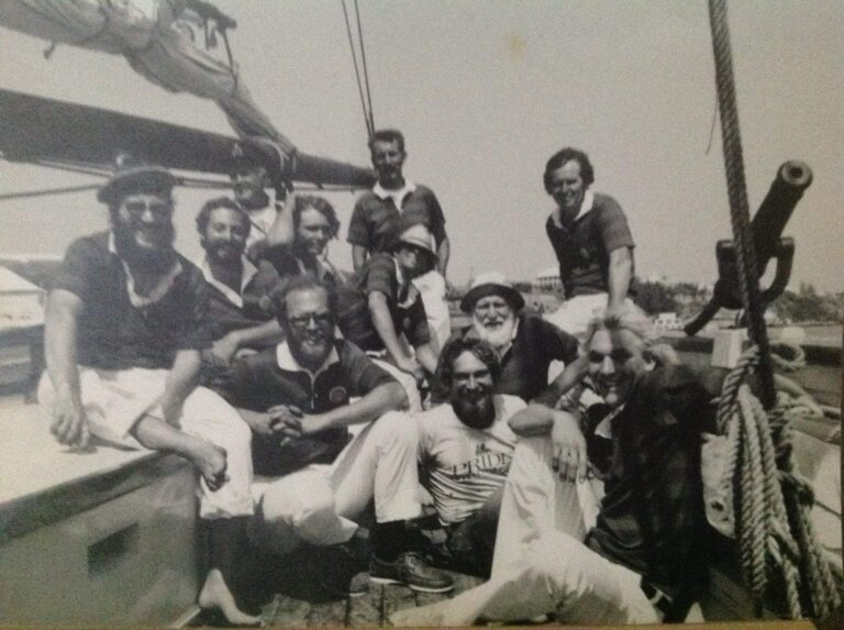 (L-R): Mark D’Anci (Steward-Cook, with glasses, seated wearing tam o’ shanter), John Peterlin, Captain Melbourne Smith (wearing cap, standing in front of the main boom), Douglas Griffith (foreground), Peter Boudreau (behind Doug), Andrew Davis (with hat next to Peter), Chief Mate Charles Whitcomb (standing behind Andy Davis), Michael Kozma (seated foreground next to Doug Griffith), Gerald “Gerry” Trobridge (white beard and hat behind Mike Kozma), Michael Walsh (seated in foreground inboard of the swivel gun), and Allen Rawl (seated on the bulwark behind Gerry Trobridge)
